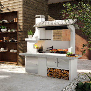 Gratar Andros 2 cu structura metalica interior hota, vatra consolidata cu perete dublu cu un continut mare de aluminiu,  blat din Marmotech finisaj antichizat, gratar standard 76x40cm , tratament hidrofug blat.