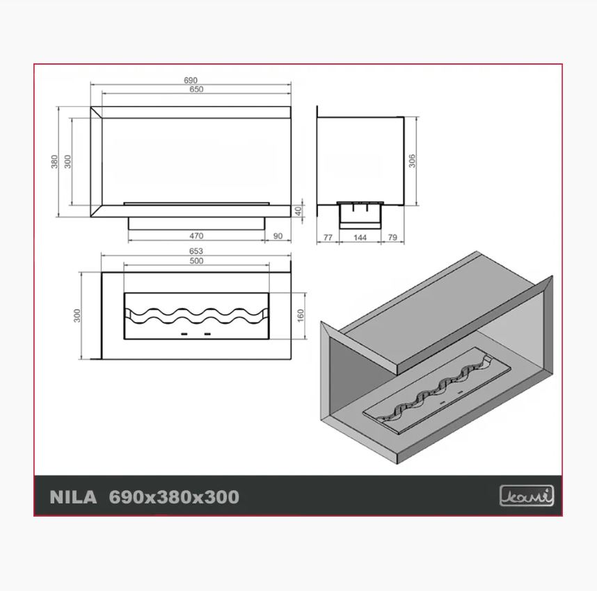 Șemineul bio încorporat Nila permite o amenajare interesantă a spațiului. Rama șemineului bio este fabricată din tablă de oțel cu grosimea de 1,5 mm și vopsită în câmp electrostatic în negru semimat. Șemineul bio poate fi deschis pe partea stângă sau dreaptă. De asemenea, puteți alege accesorii suplimentare, cum ar fi sticlă securizată cu înălțimea de 15 cm pe ambele părți și un suport din oțel oglindit care reproduce vizual focul. Datorită dimensiunilor și greutății, șemineul bio Nila este livrat pe palet.