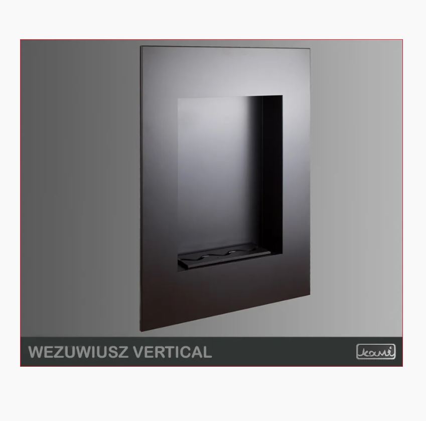 Construcția acestui model constă dintr-un cadru de oțel cu grosimea de 1,5 mm (focar și cadru), acoperit cu vopsea neagră semi-mată, rezistentă la căldură. În interiorul focarului se află o cameră care conține un insert de biocombustibil. Carcasa arzătorului are orificii de ventilație de siguranță care previn acumularea vaporilor de biocombustibil în caz de scurgeri accidentale (de exemplu, în timpul reumplerii) și le permit să iasă. Modelul Vezuwiusz Vertical dispune de un sistem de montare format din două suporturi nituite solid și două console care mențin șemineul cu biocombustibil perfect paralel cu peretele.